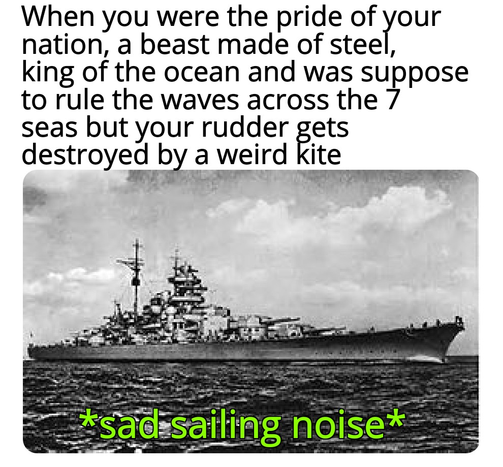 This meme is from my instagram like in the video if you like historical videos you can also check out my instagram master daffa song. This thread is archived. The bismarck started firing fifteen miles away we gotta sink the bismarck was the battle sound but when the smoke had cleared away the mighty hood went down for six long days and weary nights they.